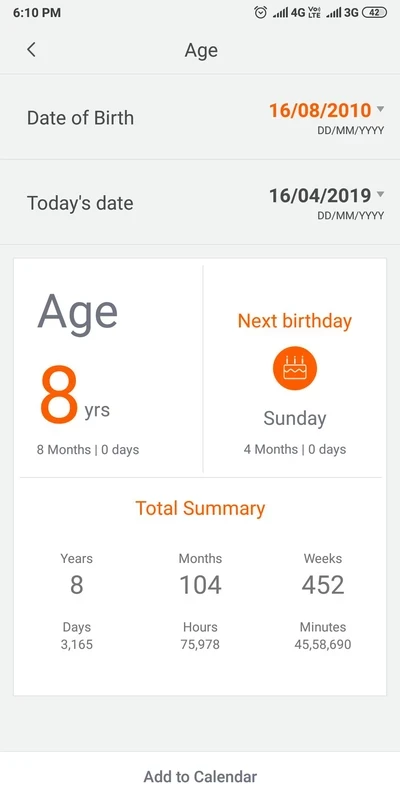 يُسهّل التطبيق أيضًا عملية حساب العمر، مما يُمكّن المستخدمين من تحديد العمر بدقة بسهولة. لذا، يُمكنك استخدامه بثقة لأغراض متعددة، مثل حساب أعياد الميلاد والذكرى السنوية، بالإضافة إلى تحديد عمر الأحداث التاريخية. ما عليك سوى اختيار الخيار، وإدخال التواريخ، والحصول على النتائج الدقيقة.